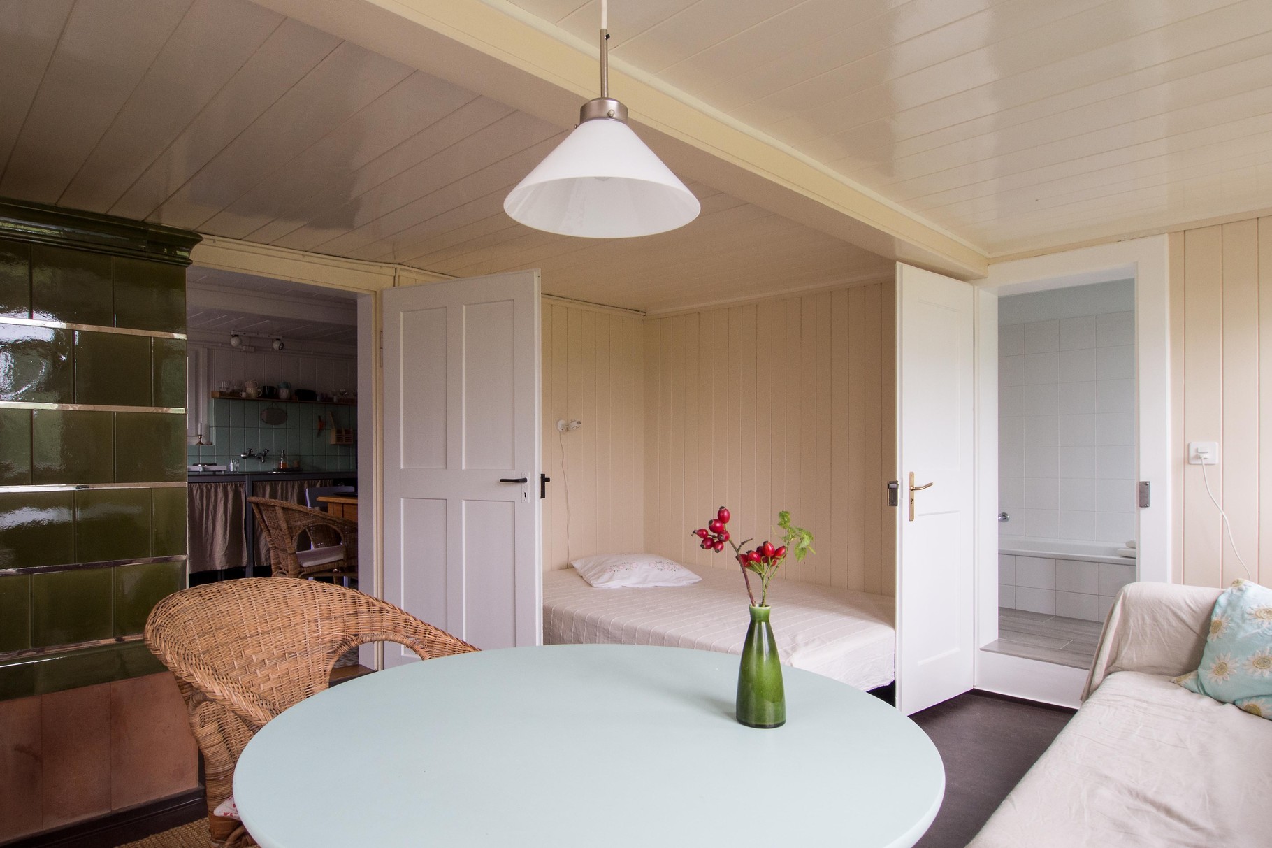 Küche , eine Stube mit einer kleinen Sitzecke, einem Doppelbett und einem Sofa, ein Bad und eine sep. Toilette.
